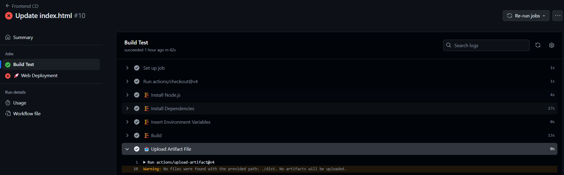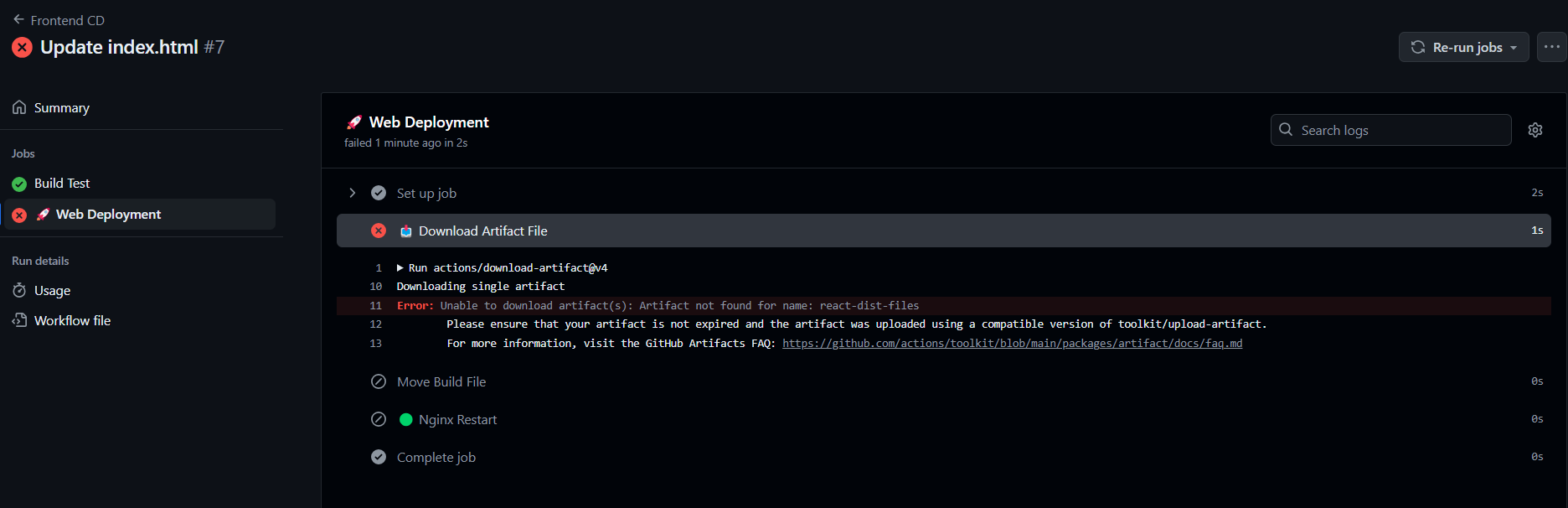 하지만 ARTIFACT_DIRECTORY에 working-directory의 root 경로가 설정되지 않아 에러가 발생했습니다. 파일은 './dist' 경로에 업로드되어 있었기 때문에, Artifact를 다운로드하기 위해 './frontend/dist' 경로를 방문했을 때 파일이 존재하지 않았습니다.