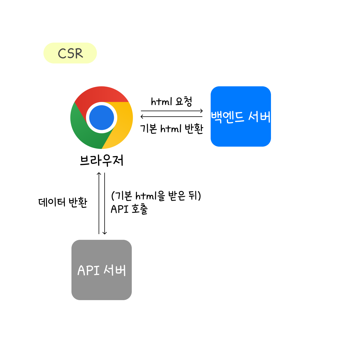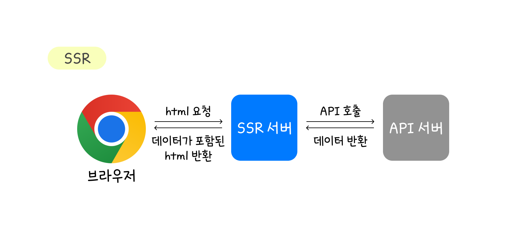 브라우저는 SSR 서버에 HTML을 요청하고, SSR 서버에서 API 서버로 데이터를 응답받은 뒤 HTML에 끼워 넣어 완성된 HTML을 브라우저로 전달한다.