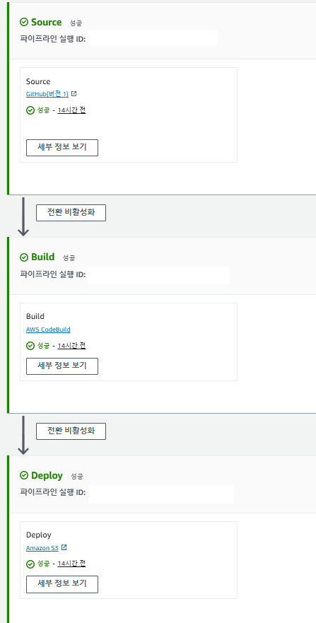 개발 서버와 운영 서버의 파이프라인은 동일한 방식으로 구축하고, 환경 변수와 빌드 명령어만 다르게 설정했습니다. 파이프라인은 3단계로 구성됩니다. (추후 CDN 캐시 무효화를 위한 Lambda 설정이 추가될 예정입니다.)