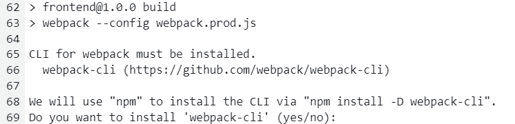 운영 서버 배포 시 webpack-cli가 설치되지 않아 webpack-cli 설치 여부를 묻는 메시지가 출력되는데, buildspec 스크립트에서는 npm run build 명령어 이후 별다른 조치를 취하지 않아 빌드에 실패했던 것이었습니다.