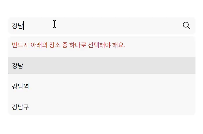 현재 comboBoxList에 표시되는 데이터들은 API 호출을 통해 받아오고 있는데요. input이 변경되면 API 호출이 일어나 comboBoxList 데이터들이 변하게 됩니다. 만약 "강남"을 입력한 뒤 방향키를 아래로 내려 "강남역"이라는 데이터에 포커싱이 이동하면, input은 "강남"에서 "강남역"으로 바뀌게 되고 API 호출이 일어나게 되겠죠. 방향키 조작 횟수가 증가하게 되면 불필요한 API 호출이 누적될 것으로 생각했고, 따라서 화면상에서만 보이는 displayedValue를 두어 InputComboBox 컴포넌트 내부에서만 관리되도록 했습니다.